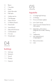 96 97 97 98 98 99 99 99 99 100 100 101 101 101 102 Music Calculator Email Audio Recorder FM Radio Update centre File Manager Smart Doctor LG Mobile Switch Downloads SmartWorld RemoteCall Service Cell Broadcast Chrome Google apps 04 05 Appendix 131 131 132 134 135 135 136 137 138 140 LG Language Settings LG Bridge Phone software update Anti-Theft Guide Open Source Software Notice Information Regulatory information (Regulation ID number, E-labeling, etc.