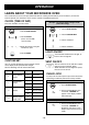 OPERATION AUTO COOK CHART CATEGORY SERVINGS 1.75 oz. (50g) 3.0 oz. (85g) 3.5 oz. (100g) POPCORN POTATO BEVERAGE DIRECTIONS QUANTITY 1 serving 2 servings 3 servings 4 servings 8 oz. 16 oz. 24 oz. 32 oz. Place bag on turntable. Follow manufacture’s instructions. (227g) (454g) (680g) (907g) Wash and scrub well. Pierce with fork. Place on microwave saft rack or paper towel in a circle (1"-2.5cm), apart. Let stand 3 to 5 minutes after cooking. Coffee/Tea (Refrigerated Temp.) 1 cup (8 oz.