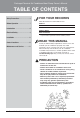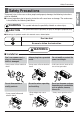 Safety Precautions n Operation Do not place objects on the power cord. Protect the cord from being pinched or damaged. • There is danger of fire or electric shock. Do not place the power cord near a heater. • It may cause fire and electric shock. Use a dedicated circuit for this appliance. • An overloaded circuit is a fire hazard. Do not allow water to run into electric parts. • It will cause failure of machine or electric shock.