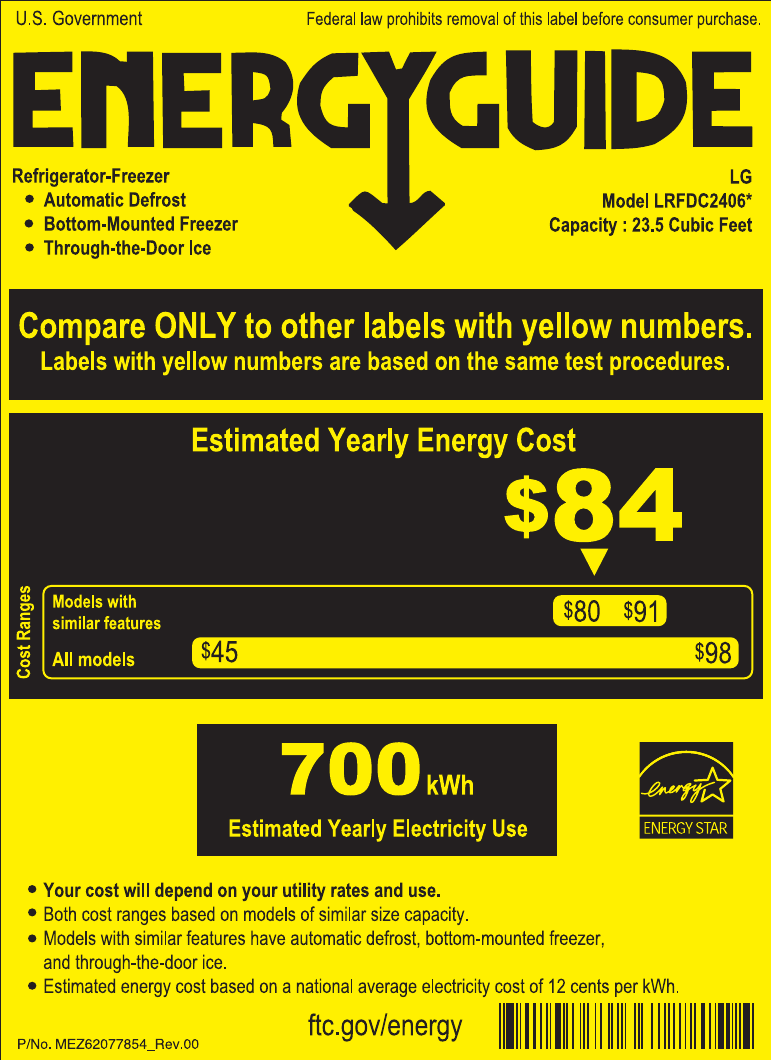 Odor! iw prohibits removal of tis label before consumer purchase. U8. Government Refrigerator-Freezer LG Mode! LRFDC2406" Automatic Defrost = Bottom-Mounted Freezer Capacity : 23.5 Cubic Feet # Through-the-Door ice Compare ONLY to other labels with yellow numbers. Labels with yellow numbers are based on the same test procedures. Estimated Yearly Energy Cost Tv Ire 30 $91 | FUT 700 po Estimated Yearly Electricity Use © Your cost wii! depend on your utility rates and use.
