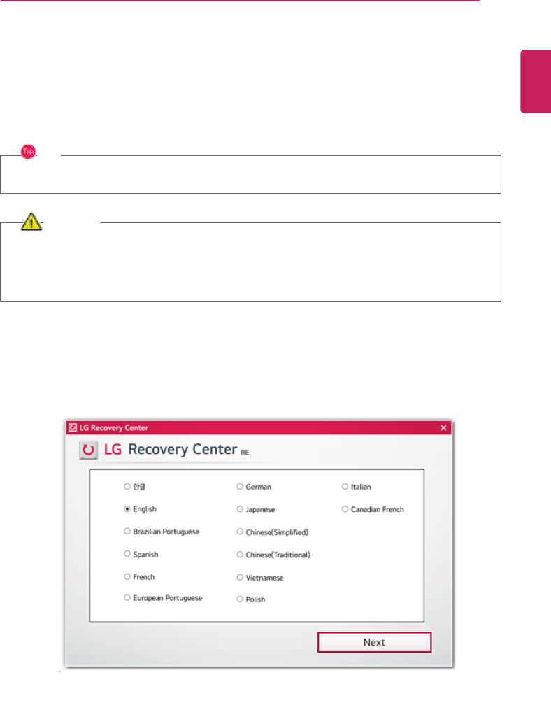2 Once LG Recovery Center RE is started, select a language and press the [Next] button.