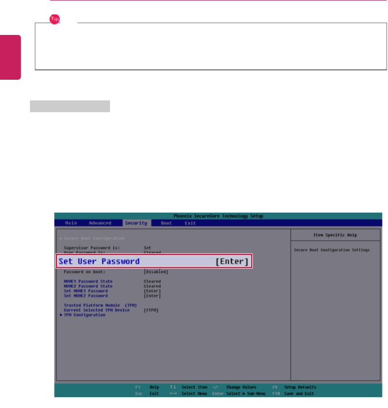 2 When the Security item appears, press the [Enter] button in the [Set User Password] menu.