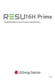 Product Specification (1/2) RESU16H Prime Electrical Characteristics Usable Energy1) Charge Discharge Max. Charge/Discharge Current Max. Charge/Discharge Power Peak Power (only discharging)2) Peak Current (only discharging) Battery Chemistry Communication Interface Voltage Range DC Protection Connection Method User interface Protection Features Scalability (Total Energy, Max. Charge/Discharge Power) 16.0 kWh @77°F (25°C) 420 ~ 450 VDC 350 ~ 410VDC 20A@350V 7 kW 11 kW for 10 sec. 32.8A for 10 sec.