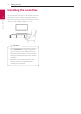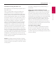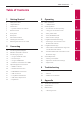 Table of Contents 5 Table of Contents 1 Getting Started 3 Operating 2 6 6 6 7 8 8 9 10 11 Safety Information Unique features Introduction – Symbols used in this manual Remote control Front panel Rear panel About LED condition Installing the sound bar Mounting the main unit on a wall 23 23 23 23 23 24 24 25 26 26 2 Connecting 28 28 13 13 15 15 15 17 18 19 19 20 20 21 21 21 22 Connecting the AC Adapter Wireless subwoofer connection Connecting to your TV – Using an OPTICAL cable – LG Sound Sync –