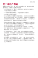 行车安全 查阅有关在驾驶时使用设备的本地法律法规。 • 不要在驾驶时使用手持式设备。 • 将注意力完全集中在驾驶上。 • 如果行驶条件需要,请在拨打或接听电话之前将车辆驶离道路并 停车。 • 射频能量可能影响车辆内的电子系统,例如立体声音响、安全设 备等。 • 当车辆配备气囊时,不要让安装的便携式的无线设备阻挡气囊。 这样做可能因性能不当而导致气囊无法释放或导致严重受伤。 • 如果您在外出时使用耳机收听音乐,请确保将音量设置为合理的 音量级别,以便注意周围的情况。在靠近马路时,尤其要注意这 一点。 防止损伤您的听力 为防止听力可能受损,请勿长时间高音量倾听。 如果您长时间置于高音环境中,那么您的听力可能会遭到伤害。因 此,我们建议您在开机或关机时不要将装置置于耳边。同时,我们还 建议您将音乐和通话音量设置为合理的音量级别。 • 使用耳机时,如果您不能听到附近的人说话,或者坐在您旁边的 人能听到您在听的内容,则将音量调低。 • 耳机声音压力过大可能导致听力受损。 安全及有效使用准则 8