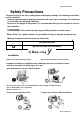 Safety Precautions Operation Plug in the power plug properly. Do not operate or stop the unit by inserting or pulling out the power plug. Do not damage or use an unspecified power cord. Otherwise, it will cause electric shock or fire. It will cause electric shock orIt will cause electric shock or fire. fire. Do not modify power cord length. Use the air conditioner on a Always plug into a single outlet circuit. (See page 7.) grounded outlet. Do not share the outlet with other appliances.