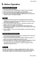 Before Operation L Before Operation Preparing for operation 1. 2. 3. 4. 5. Plug in the power plug properly. Use a dedicated circuit. Overloading the line could create a fire hazard. Do not use an extension cord. See page 11 for more details. Do not start/stop operation by plugging/unplugging the power cord. If the power cord is damaged and requires replacement, have an Authorized Servicer install an exact replacement part. Usage 1.