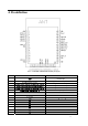4. Pin definition Pic 1-4 LSD4WF-2MD05106 Module pin layout PIN Pin Definition Function 1 Ground pin 6 GND JTAG_CLK/GPIOE_4 JTAG_TDO/PWM2/SPI0_MOSI/GPIOE_2 JTAG_TDI/PWM1/SPI0_CLK/GPIOE_1 JTAG_TMS/PWM3/SPI0_MISO/GPIOE_3 PWM0/SPI0_CS0/GPIOE_1 7 NC NC 8 GPIOC_4 VDD NC NC NC NC NC NC GPIO 2 3 4 5 9 10 11 12 13 14 15 Program download port Program download port Program download port Program download port Multiplex pin VCC(DC_3.