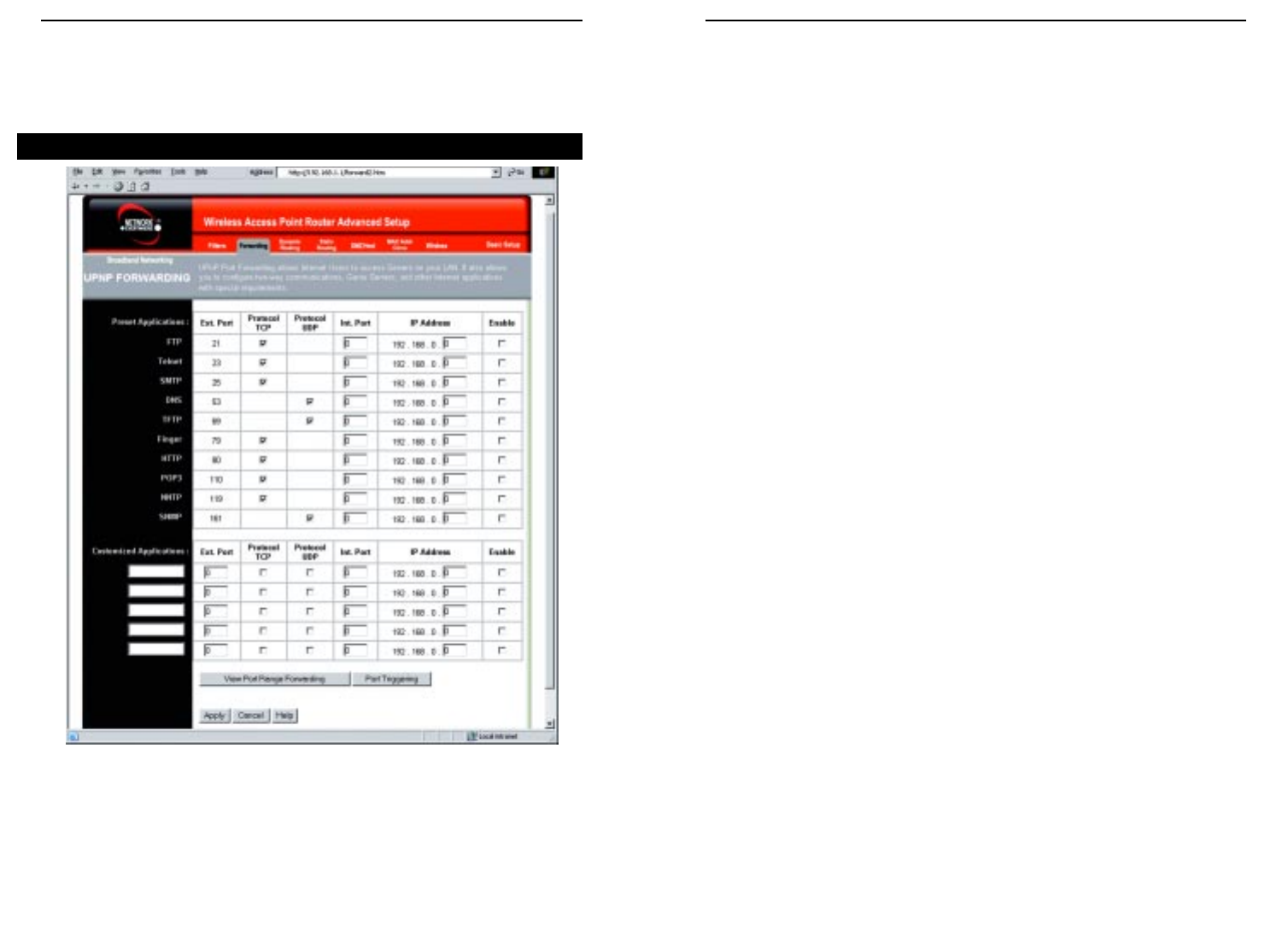 Clicking the Forwarding tab will access the UPnP Forwarding screen, shown in