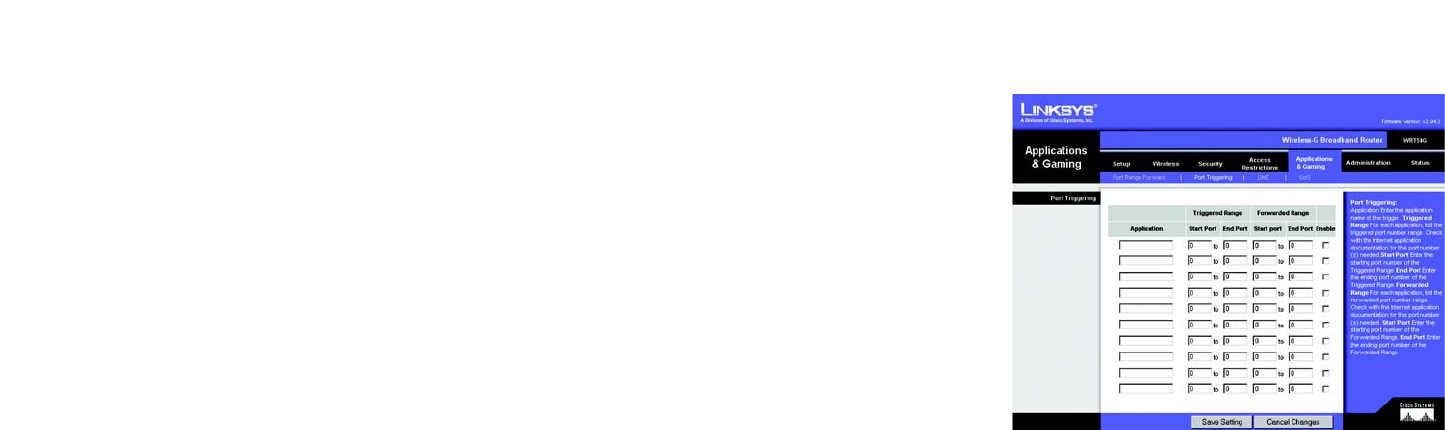 The Port Triggering screen allows the Router to watch outgoing data for specific port numbers. The IP address of