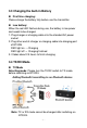 3.3 Charging the built-in Battery First time charging: Please charge the battery fully before use the transmitter. Low battery: When the red LED flashes during use, the battery is low power and needs to be charged. 1. Plug charger or charging cable into the standard AC power socket 2. Plug other end of charger or charging cable into charging port of BT0024 RED light on → Charging RED light off → Charging finished 3. It takes about 2.5 hours to finish charging 3.