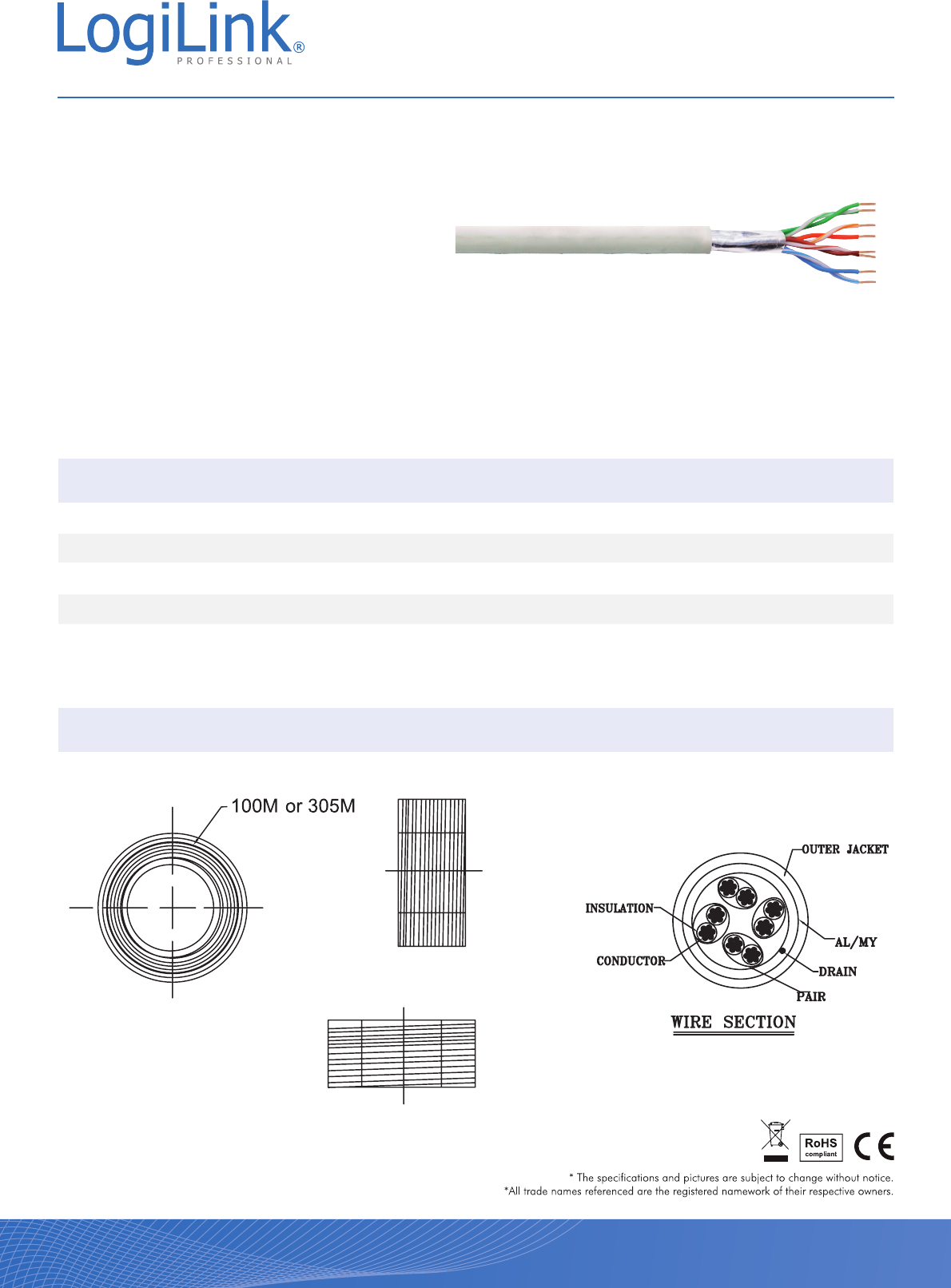 Length Part no. EAN Code 100 m CPV0013 4260113565537 305 m CPV0016 4260113565544 Package Contents Packaging Informations(CPV0013) Packing Dimension 260 x 260 x 100mm Packing Weight 2.25kg Carton Dimension 540 x 280 x 320mm Carton Q‘ty 6pcs Carton Weight 15kg Packaging Informations(CPV0016) Packing Dimension 370 x 370 x 210mm Packing Weight 6.8kg Carton Dimension 455 x 385 x 385mm Carton Q‘ty 2pcs Carton Weight 15.6kg www.logilink.