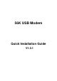 Installation 1. Plug in your 56K USB Modem to your USB port. .'OH' LED: On while dialing and connected; off after disconnected. .'DATA' LED: Blinking during data sending/receiving.
