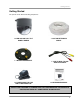 Getting Started Getting Started The system comes with the following components: 1 x MINI COLOR PAN / TILT DOME CAMERA 1 x MOUNTING BRACKET 1 x POWER ADAPTOR FOR DIN TO BNC ADAPTOR 1 x 60’ DIN EXTENSION CABLE 1 x DIN TO BNC / RS-485 ADAPTOR CABLE 1 x HARDWARE MANUAL CHECK YOUR PACKAGE TO CONFIRM THAT YOU HAVE RECEIVED THE COMPLETE SYSTEM, INCLUDING ALL COMPONENTS SHOWN ABOVE.