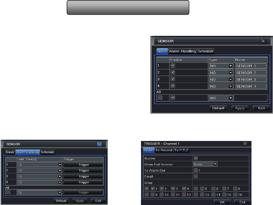 Step1: enter into system configurationalarm configurationsensoralarm handling; refer to Fig 4-20: