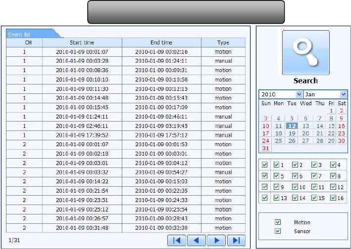 Step2: click the highlight date and select record channels and then tick off the event type: motion and sensor. Then click “search”
