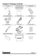 Chapter 2 Package Contents DC190 Quick Start Guide 4-Step Card (For download of other language versions, please visit Lumens website) Microscope Adapter VGA Cable USB Cable Audio Cable Power Cord Remote Control Appearance may vary depending on country/region Remote Control Holder Pouch Accessory Pouch English - 6