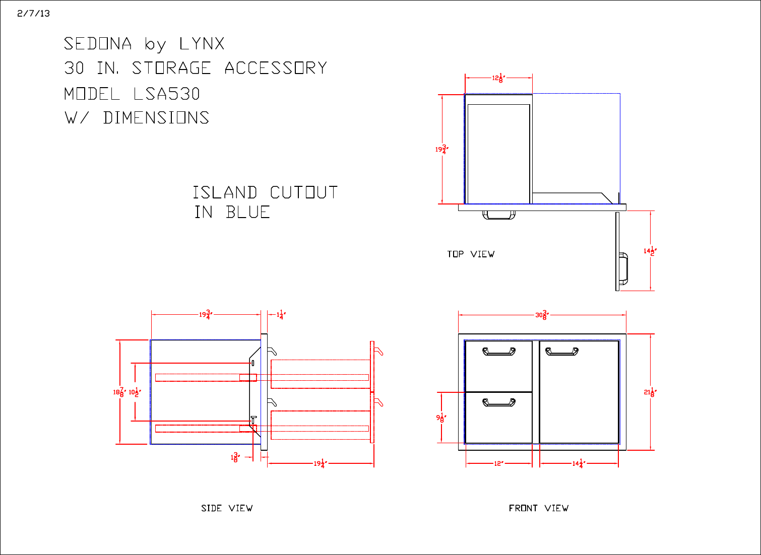 2/7/13 SEDNA by LYNX 30 IN, STORAGE ACCESSORY MODEL LSAS30 W/ DIMENSIONS ISLAND CUTOUT IN BLUE TOP VIEW | | SIDE VIEW FRONT VIEW wi