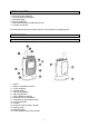 VSEBINA PAKETA 1 x enota za otroka (oddajnik) 1 x enota za starše (sprejemnik) 1 x polnilna postaja 2 x AC/DC napajalnik 1 x akumulatorski paket (3 x baterija tipa AAA) 1 x navodila za uporabo Če katera od teh komponent manjka, prosimo, da se obrnete na svojega trgovca. SESTAVNI DELI Enota za starše (sprejemnik) 1. Antena 2. Stikalo za vklop/izklop alarma 3. 6 V/DC priključek 4. Polnilna postaja 5. Tipka za vklop/izklop 6. Tipki za glasno/tiho 7. Izbirno stikalo za melodijo 8.