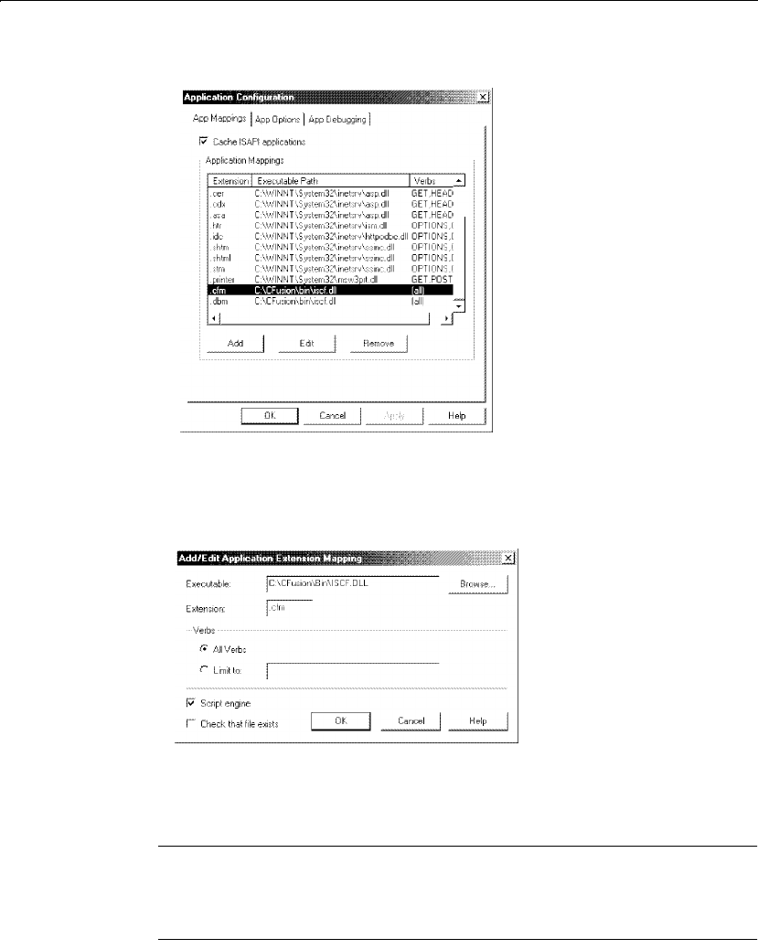 4 In the App Mappings tab, select entries for.cfm and .dbm, and click Remove.