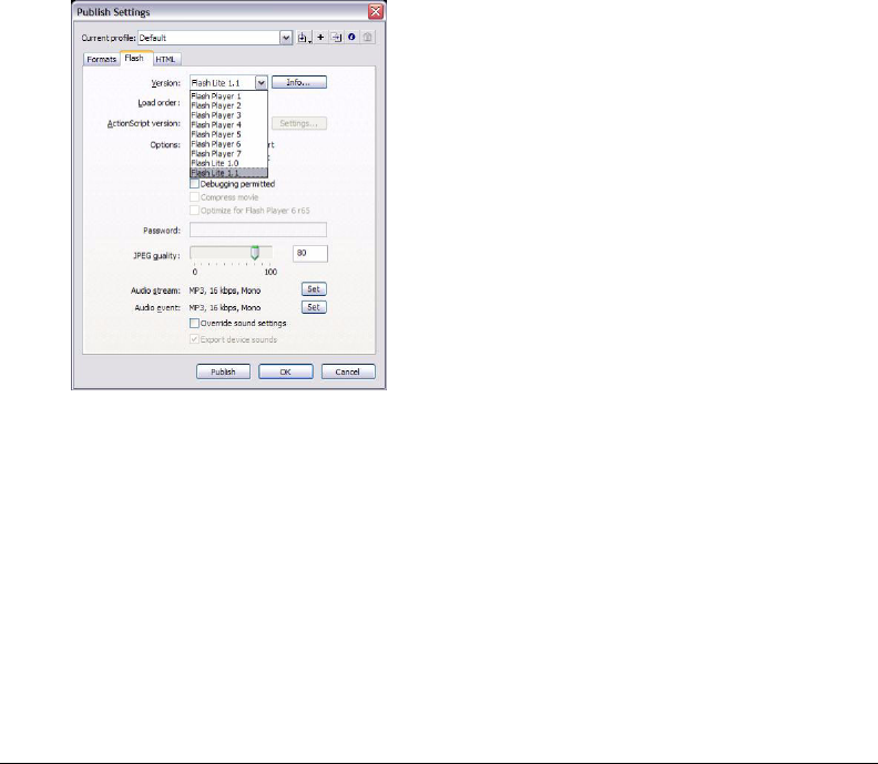 Select File > Publish Settings, and then select the Flash tab. The Publish Settings dialog box with