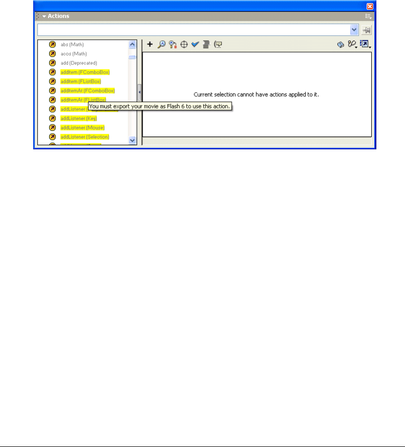 Note: Highlighted ActionScript in the Actions panel provides guidelines on what is supported in