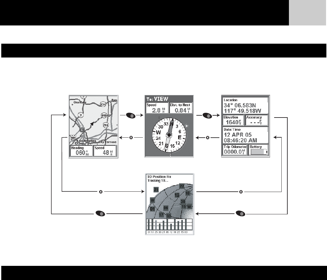 The eXplorist has three navigation screens as well as a Satellite Status screen that can be accessed by
