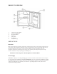 PRODUCT OVERVIEW 1. 2. 3. 4. 5. 6. 7. Thermostat Control Knob Freezer Compartment Removable Shelf Drip Tray Dairy Rack Bottle Rack Adjustable Legs PRECAUTIONS Placement Make sure the following placement requirements are adhered to in order to ensure that the refrigerator will work properly. The back of the refrigerator needs to be positioned at least 5 inches from the wall. Each of the sides of the refrigerator requires at least 5 inches of distance from the surrounding walls.