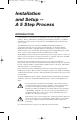 4100_Ins_eng 6/16/05 12:34 PM Page 8 Installation Guide SUMMARY OF INSTALLATION Following is a summary of the procedures to install and set up your Bell ExpressVu system. We recommend that you perform the procedures in the order presented. 1. Unpack the satellite antenna, receiver, and parts (see page I-6) and the optional installation kit, if you purchased one (see page I-3). 2. Review "What You Need to Know" (see page I-6). 3.