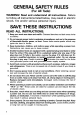 GENERAL SAFETY RULES (For All Tools) WARNING! Read and understand all instructions. Failure to follow all instructions listed below, may result in electric shock, fire and/or serious personal injury. SAVE THESE INSTRUCTIONS READ ALL INSTRUCTIONS. 1. Keep your work area clean and well lit. Cluttered benches and dark areas invite accidents. 2. Do not operate power tools in explosive atmospheres, such as in the presence of flammable liquids, gases, or dust.
