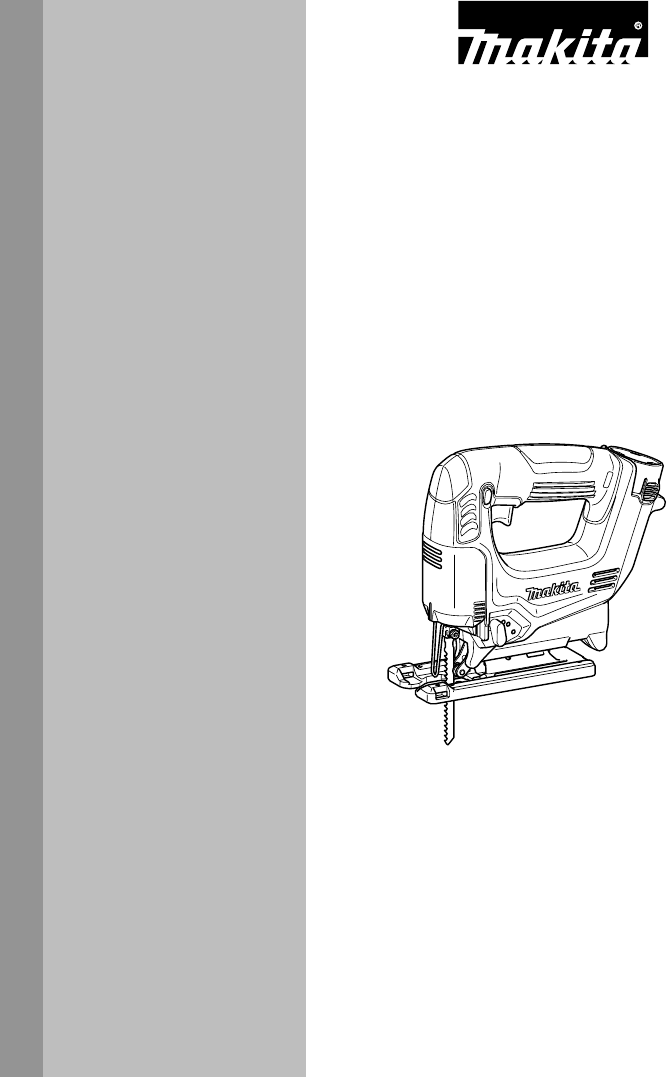 ENGLISH (Original instructions) SPECIFICATIONS Model VJ01 Length of stroke 18 mm (11/16") Strokes per minute (min-1) 0 - 2400 Blade type Max. cutting capacities B type Wood 65 mm (2 - 9/16") Mild steel 2 mm (1/16") Aluminum 4 mm (5/32") Overall length 231 mm (9 - 1/8") Rated voltage D.C. 10.8V / 12V max Standard battery cartridges BL1014 Net weight 1.7 kg (3.