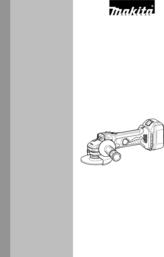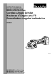 ENGLISH (Original instructions) SPECIFICATIONS Model XAG01 Wheel diameter 115mm (4-1/2") Spindle thread 5/8" No load speed (RPM) 10,000 /min Overall length 317 mm (12-1/2") Net weight 2.0 kg (4.4 lbs) Rated voltage 2.3 kg (5.0 lbs) D.C. 18 V Standard battery cartridge BL1815N BL1830, BL1840 • Due to our continuing program of research and development, the specifications herein are subject to change without notice. • Specifications and battery cartridge may differ from country to country.