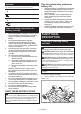 Tips for maintaining maximum battery life Symbols The followings show the symbols used for tool. 1. volts direct current 2. no load speed 3. revolutions or reciprocation per minute 4. Important safety instructions for battery cartridge 1. 2. 3. 4. 5. 6. 7. 8. 9. 10. Charge the battery cartridge before completely discharged. Always stop tool operation and charge the battery cartridge when you notice less tool power. Never recharge a fully charged battery cartridge.