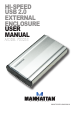 Thank you for purchasing the MANHATTAN ® Hi-Speed USB 2.0, 3.5” External Enclosure, Model 703253. These easy-to-follow instructions help make installation of the enclosure quick and simple, so you’ll soon be enjoying the benefits of these features: • Supports Hi-Speed USB 2.0 data transfer rates up to 480 Mbps • Lightweight, compact design increases portability • Sturdy aluminum case protects drive and facilitates cooling • Fits standard 3.