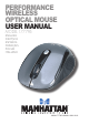 Performance Wireless Optical Mouse • User Manual English Thank you for purchasing the MANHATTAN® Performance Wireless Optical Mouse, Model 177795. For specifications, go to www.manhattan-products.com. Installation 1. On the underside of the mouse, pull out the micro receiver and plug it into a USB port on the computer. 2. Slide the cover off the battery compartment and insert the included AA battery; then replace the cover.