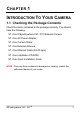 Contents C H A P T E R 1 ............................................................................................ 5 INTRODUCTION TO YOUR CAMERA ............................................................... 5 1.1 1.2 1.3 1.4 CHECKING THE PACKAGE CONTENTS ...................................5 GETTING TO KNOW YOUR CAMERA......................................6 FEATURES AND BENEFITS ...................................................10 SYSTEM REQUIREMENT....................................................