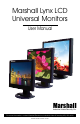 Lynx LCD Monitor User Manual Lynx LCD Monitor User Manual SPECIFICATIONS INTRODUCTION Thank you for purchasing the Marshall Lynx LCD Monitor. The Lynx Series of Universal Monitors offers high performance features and excellent picture quality for use in a variety of industrial/commercial applications. The information contained in this instruction manual covers the installation and operation of the monitors, and we encourage you to read it carefully.