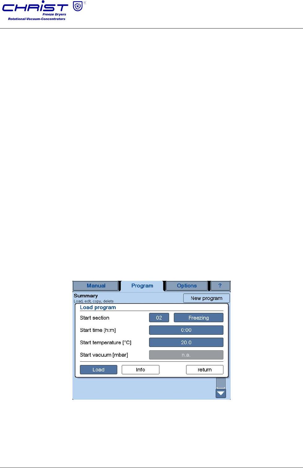 • Press the button "Program start" in order to start the freeze-drying