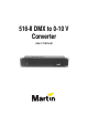 Thank you for selecting the Martin 516-II DMX to 0-10 V Converter. This device converts the digital input from Martin and DMX protocol controllers to 0 - 10 V output for use with analog lighting fixtures and other devices. SAFETY The 516-II DMX to 0-10 V Converter is not for household use. For safe operation, read this manual before use and follow the safety precautions listed below. If you have questions about how to operate the controller safely, please contact your Martin distributor or dealer.