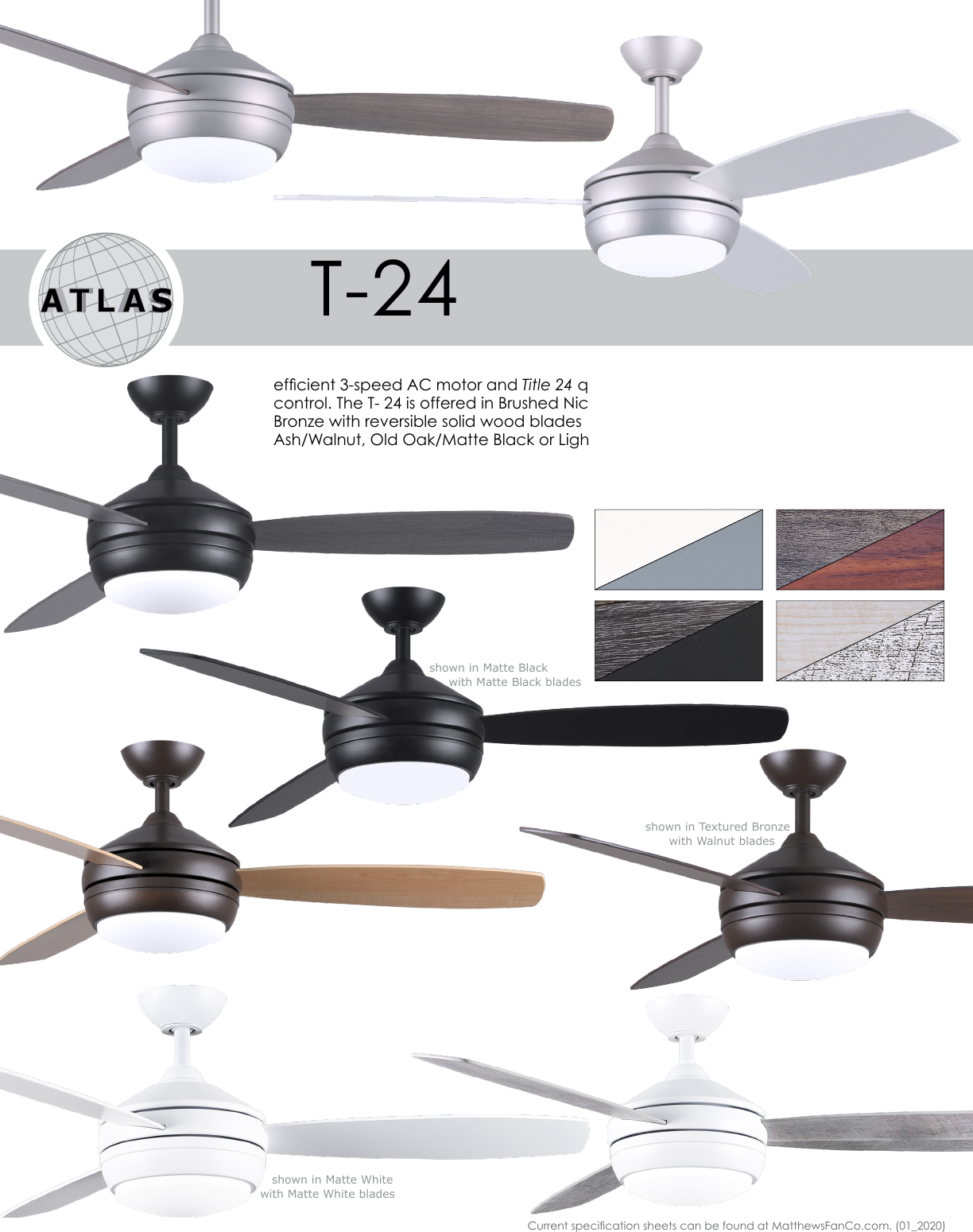 The T-24 is Matthews’ reserved, yet contemporary, 52” three-blade ceiling fan. The
