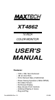 XT4862 14 INCH COLOR MONITOR USER'S MANUAL Features: • 1024 x 768, Non-Interlaced • .28 mm Dot Pitch • 72 Hz Refresh Rate (VGA/SVGA) • Power Saving Operation (VESA DPMS) • Non-Glare Screen • Full Screen Display • Easy Access Front Controls • Unlimited Palette of Colors • Plug and Play Part #MAN094 Rev 1.