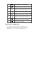 2.5 RS-485 CONTROLLER (reserved) PIN R+ RT+ T- RS-485 DEFINE RXDA RXDB TXDZ TXDY : Data Format: Data: 1 Byte / Parity: None / Start bit: 1 / Baud: 9600 Totally 3 bytes as follows: 1. Byte=0x10 :Broadcasting DVR Byte=0x80+ID Number :Joystick Control DVR (ID number:1~32) 2. Byte=Reference to the table as follows. :Commands of each button. 3. Byte= the 1st Byte+ the 2nd Byte : Command for confirm checksum.