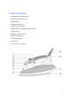2. CUMPLIR CON LA PLANCHA 1. Apagado automático Indicador de luz 2. El vapor de Control / Control de Auto Limpieza 3. Botón del rociador 4. Botón de ráfaga de vapor 5. Tapa de llenado de agua / agua de entrada 6. Botón de liberación (para quitar el tanque de agua) 7. Temperatura marcador 8. La boquilla de rociado 9. 360 ˚ rotación del cable 10. Mango de agarre suave 11. Temperatura luz indicadora 12. Dial de control de temperatura 13. Tanque de agua extraíble 14. Talón de descanso 15.