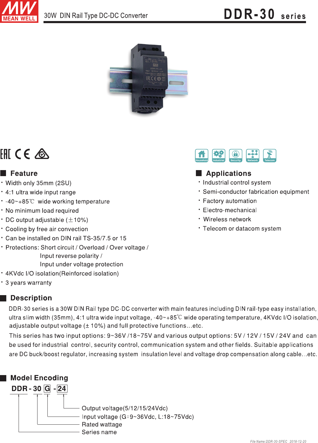 30W DIN Rail Type DC-DC Converter series Feature H Applications * Width only 35mm (2SU) * Industrial control system * 4:1 ultra wide input range * Semi-conductor fabrication equipment * wide working temperature * Factory automation * No minimum load required * Electra-mechanical * DC output adjustable * Wireless network « Cooling by free air convection * Telecommute or data com system * Can be installed on DIN rail 15 * Protections: Short circuit / Overload / Over voltage / Input reverse polarity / Input un