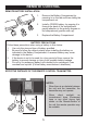OPERATION (CONTINUED) SETTING THE RADIO PRESETS (20 for FM) 1 2 Follow Steps 1-3 on the previous page to tune a station. Press the SET button; “MEMO” will appear and “1” (if no presets have ever been set), will blink in the display. 2 1 1 Press the TUNE Up/Down/Skip n / o buttons 1 to select a desired Preset (1-20). Press the SET button 2 again to confirm, the station will be saved into memory. Repeat to program up to 20 Presets, as desired.