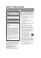 SAFETY PRECAUTIONS IMPORTANT INFORMATION IMPORTANT SAFEGUARDS WARNING : TO PREVENT FIRE OR SHOCK HAZARDS, DO NOT EXPOSE THIS APPLIANCE TO RAIN OR MOISTURE. CAUTION : To reduce the risk of electric shock, do not remove cover. Refer servicing to qualified service personnel. Electrical energy can perform many useful functions. This unit has been engineered and manufactured to assure your personal safety. But IMPROPER USE CAN RESULT IN POTENTIAL ELECTRICAL SHOCK OR FIRE HAZARD.