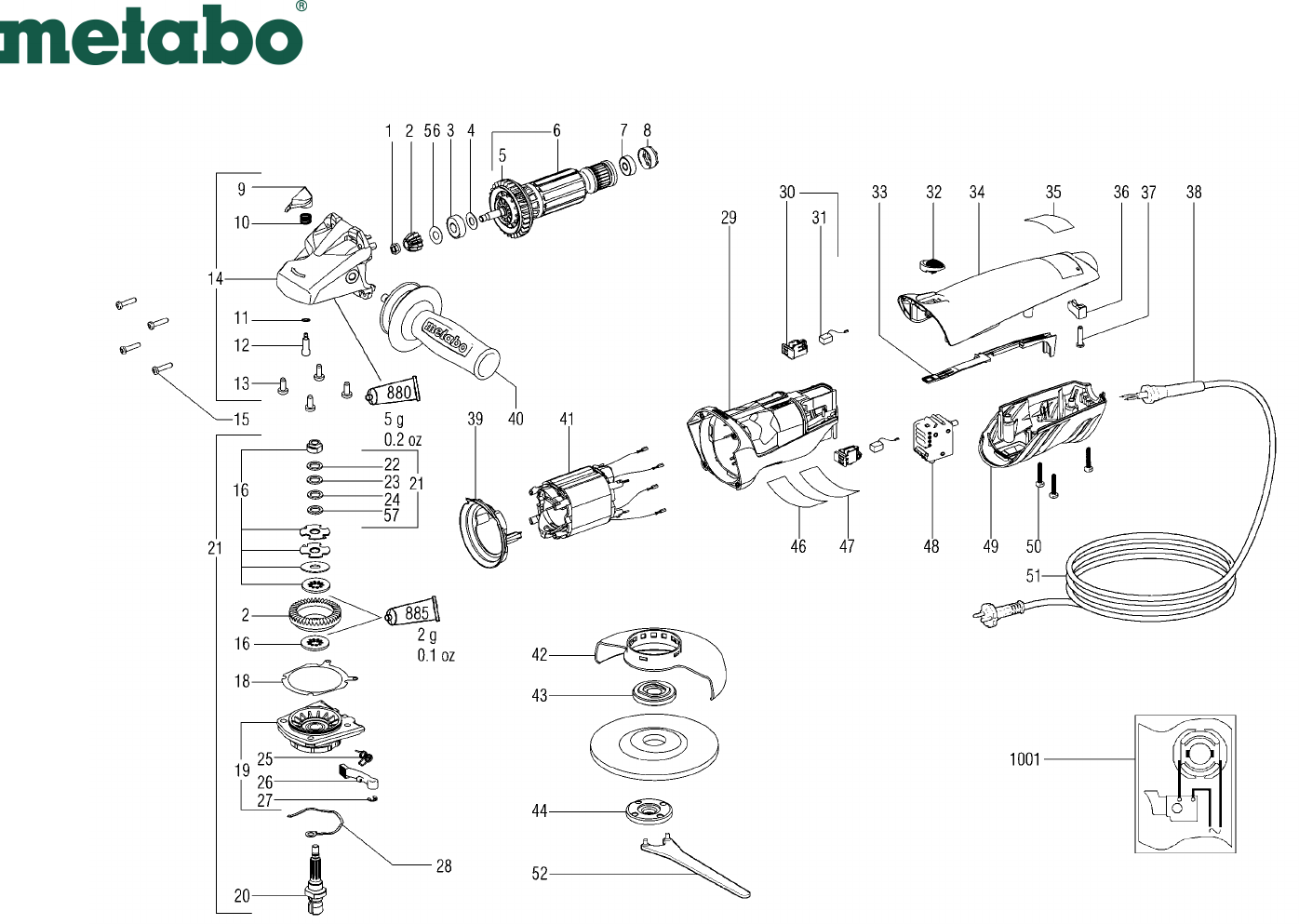 W 8-125 Позиция 43 44 46 47 48 49 50 51 52 56 57 880 885 1001 Количество 1 1 1 1 1 1 3 1 1 1 1 1 1 1 Номер для заказа 341031160 341106900 338048860 399999990 343408530 343395600 141123490 344497160 344163920 339006390 141155550 344130920 344130560 338504650 Описание Clamping flange Flange nut Rating plate Part not needed Switch Housing black Fillister head screw Cable with plug Pin spanner Washer,7,05x19,5x0,2 Washer 10,2 X 14,8X 1,0 Grease 100G Grease SF 011 50Gr 1,8oz Wiring diagram PG 22 20 11 20 14
