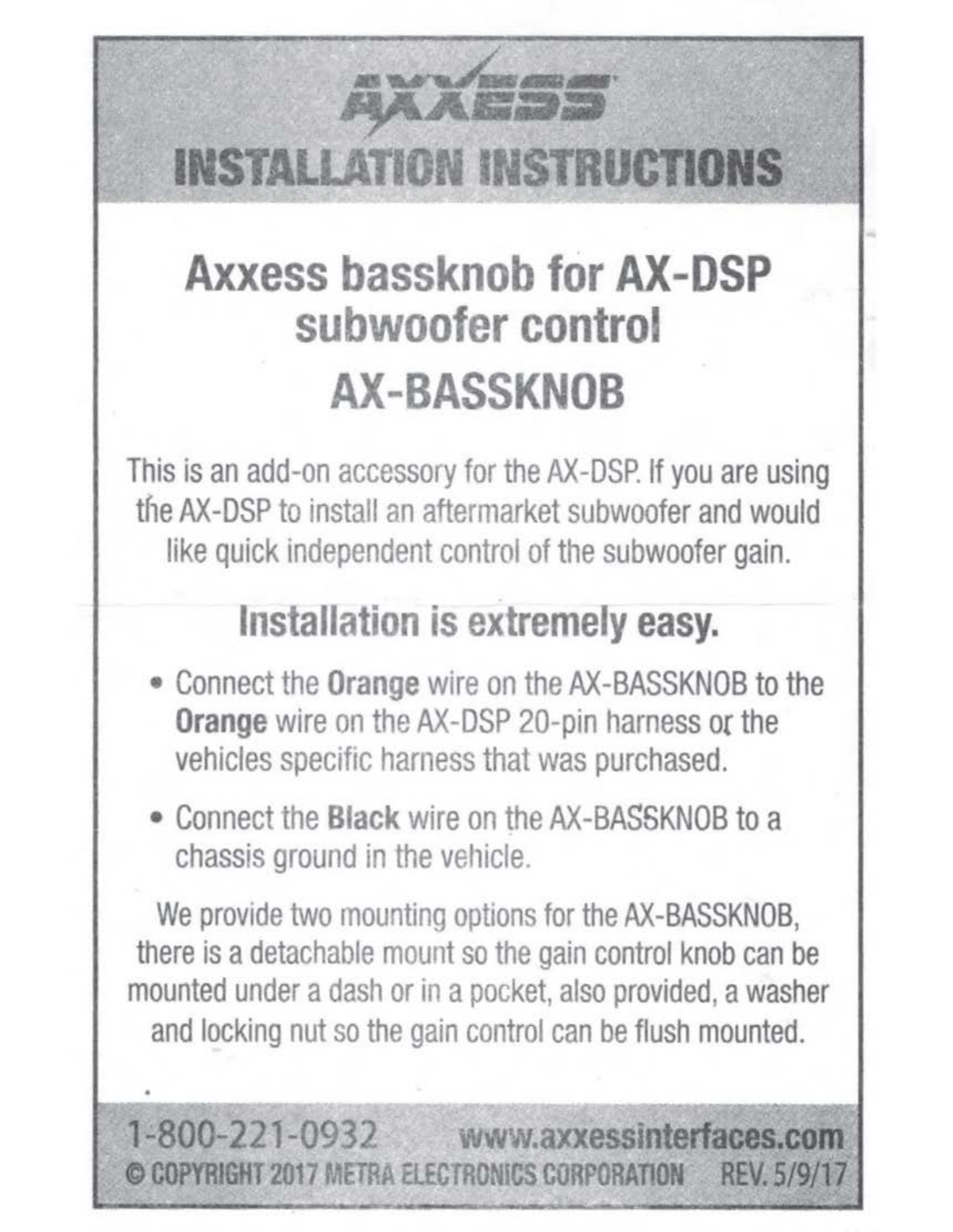 -~----- ~Al:::la INSTALLATION INSTRUCTIONS .. Axxess bassknob for AX-DSP subwoofer control AX-BASSKNOB This is an add-on accessory for the AX-DSP. If you are using the AX-DSP to install an aftermarket subwoofer and would like quick independent control of the subwoofer gain. Installation is extremely easy. • Connect the Orange wire on the AX-BASSKNOB to the Orange wire on the AX-DSP 20-pin harness or the vehicles specific harness that was purchased.