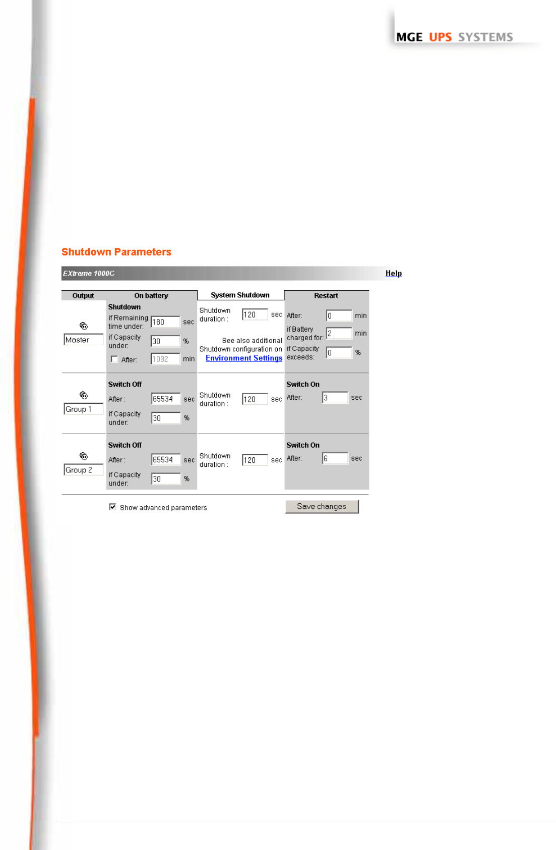 This page enables viewing and configuration of UPS operation parameters in battery mode and for power