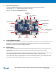 2. General Information The Atmel AVR XMEGA-E5 Xplained kit is intended to demonstrate the Atmel AVR ATxmega32E5 microcontroller. Figure 2-1 shows the available feature on the board. Figure 2-1. Overview of the XMEGA-E5 Xplained kit. Header J 1 Power measurement header USB Header J 3 connector PDI header Power & Status LEDs Mechanical button SW0 Quadrature encoder selection switch SW103 User LEDs 0 and 1 Quadrature encoder SW102 Mechanical button SW1 Light sensor Header J 2 2.